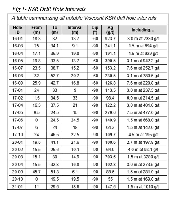 Throughout six drilling campaigns performed at the Kate, fifty-four drill holes were drilled by Viscount. Of these, twenty-five drill holes presented intervals assaying greater than 110 G/T and ten drill holes displaying intervals assaying over 400 G/T.